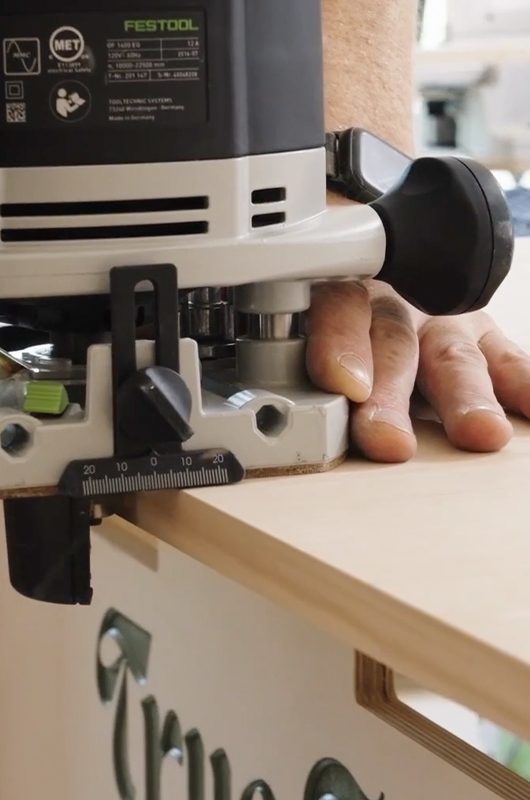 With this extra, there’s an accessory kit you can get, and this cuts it exactly flush with the side. You’ll see it’s a 3/4-in. panel, but the edge-banding is 7/8 in., so it overhangs about 1/16 in. each side. Now I’m going to take a router with this special setup and trim this edge-banding on both sides to get it nice and flush.