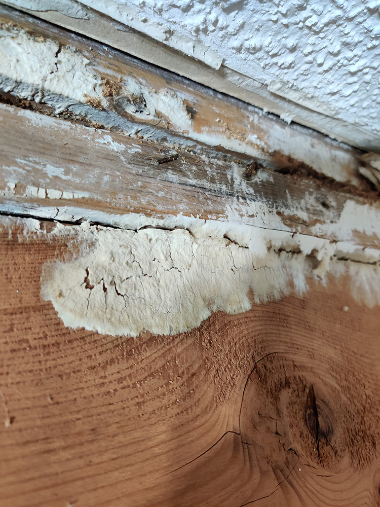 I thought there might be a mold/rot issue, but poking the boards yields solid sounding boards and the fungus doesn’t seem to be damaging the wood. I cut back the ceiling above and poked through the insulation to find solid sheathing on the outside.